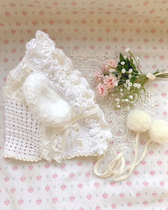 手編みのバブーシュカ♡ レースや手編みフリルたっぷりで ビーズの装飾もトッピングしました ※着用イメージのお写真はお色違いのもの 【ご注意】 ◯お写真と色合いなど若干異なる場合がございます。 ◯ご注文後のキャンセルはできません。 ◯お客様都合による返品は致しかねます。
