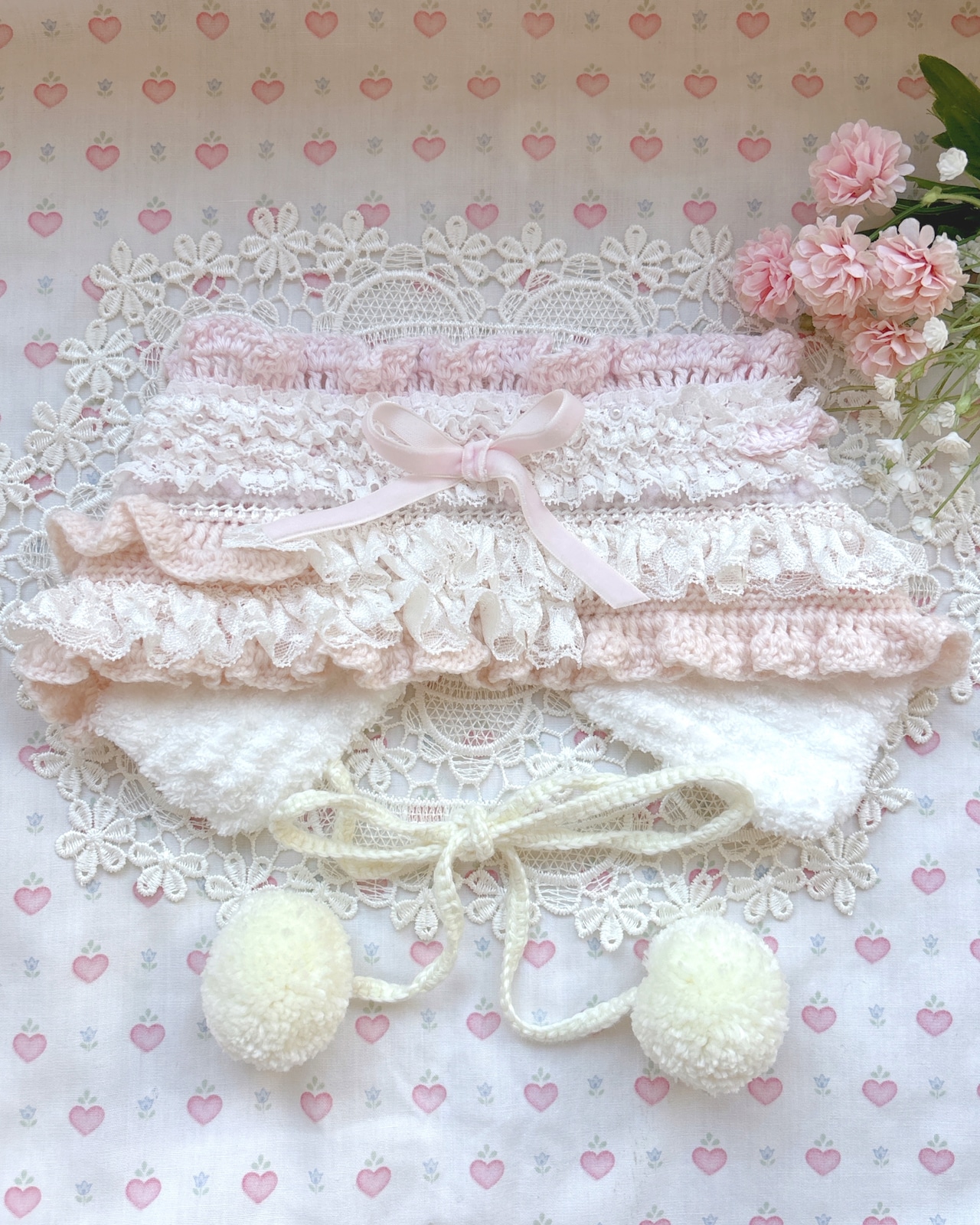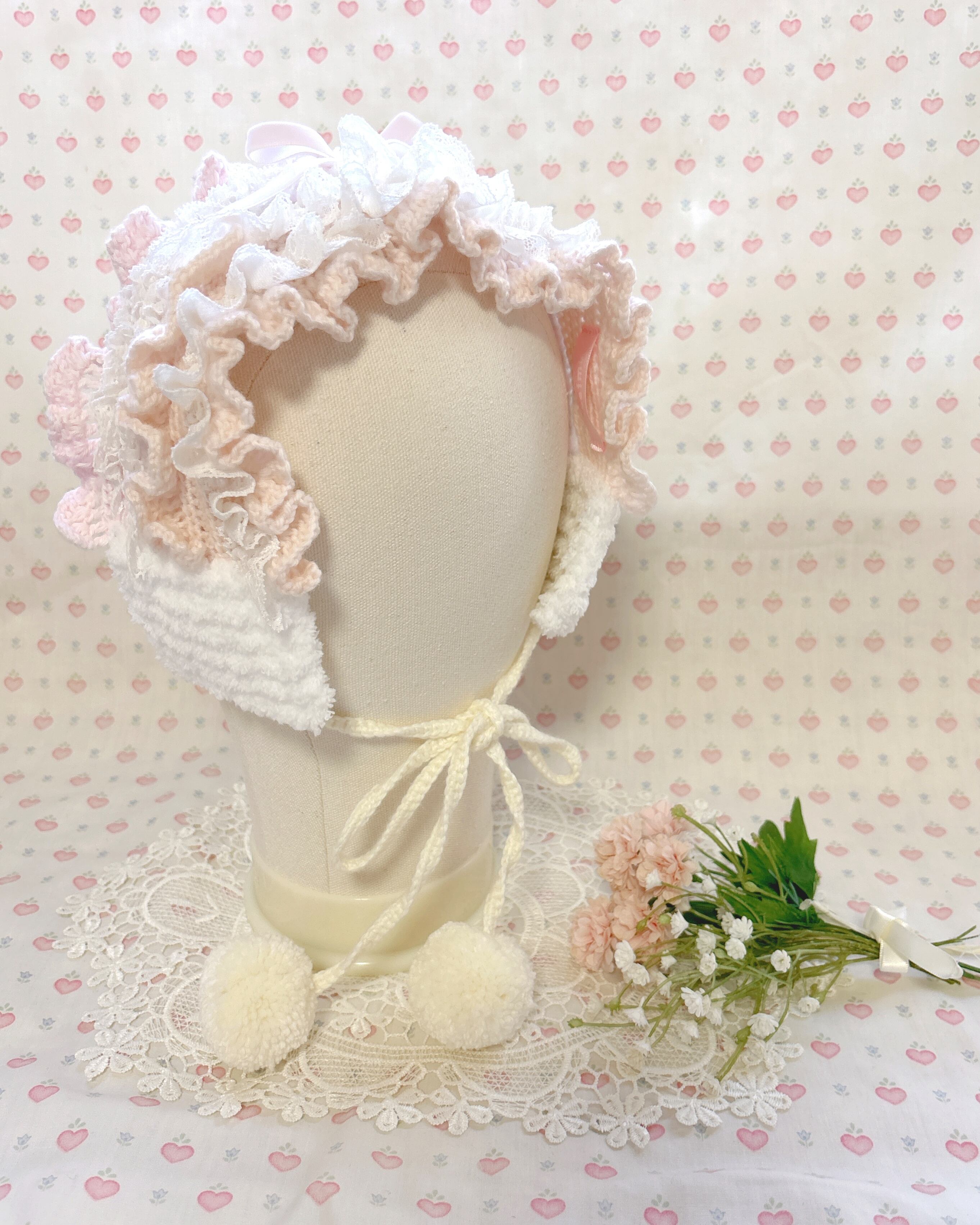手編みでできたベッドドレスのような耳当てのようなアイテムです
