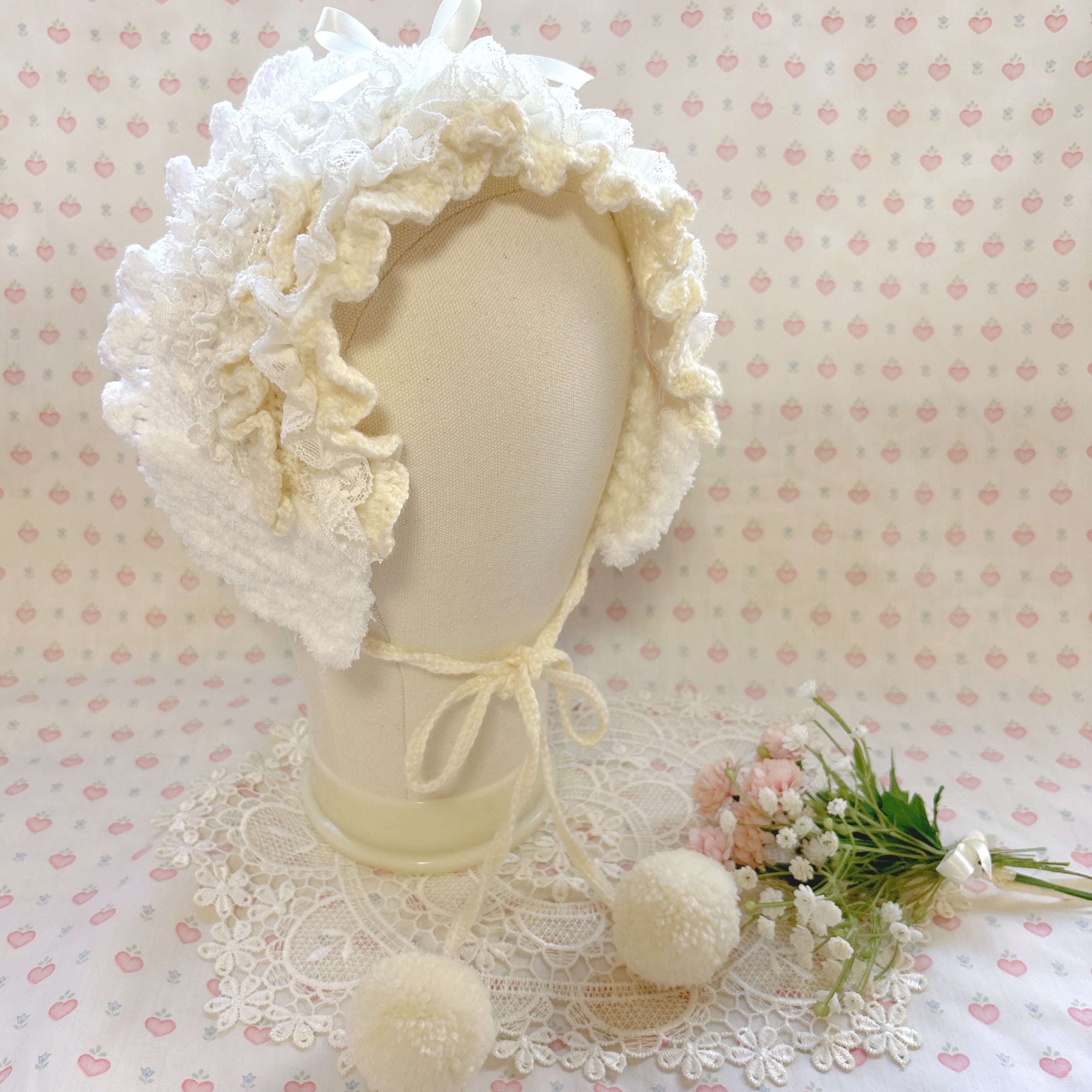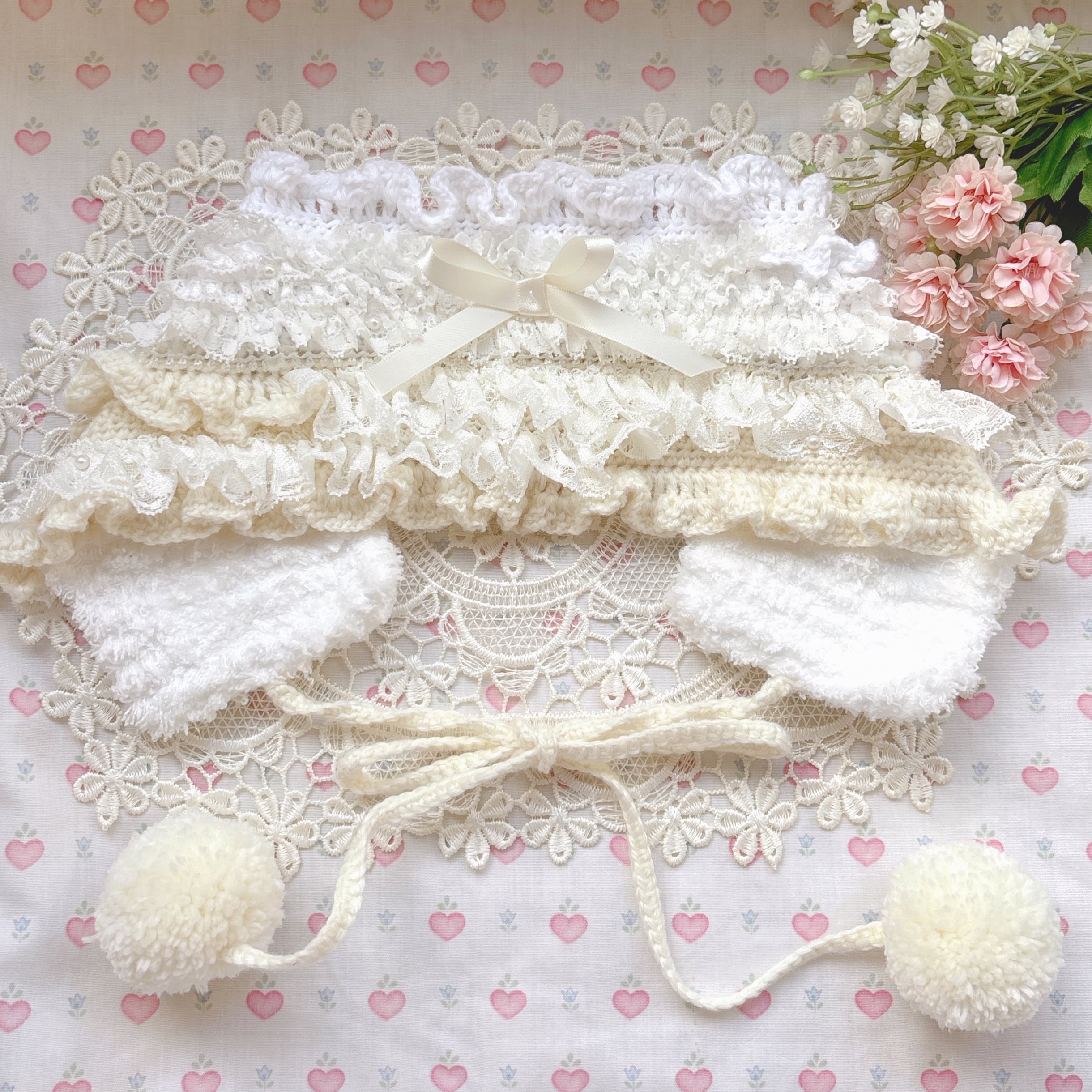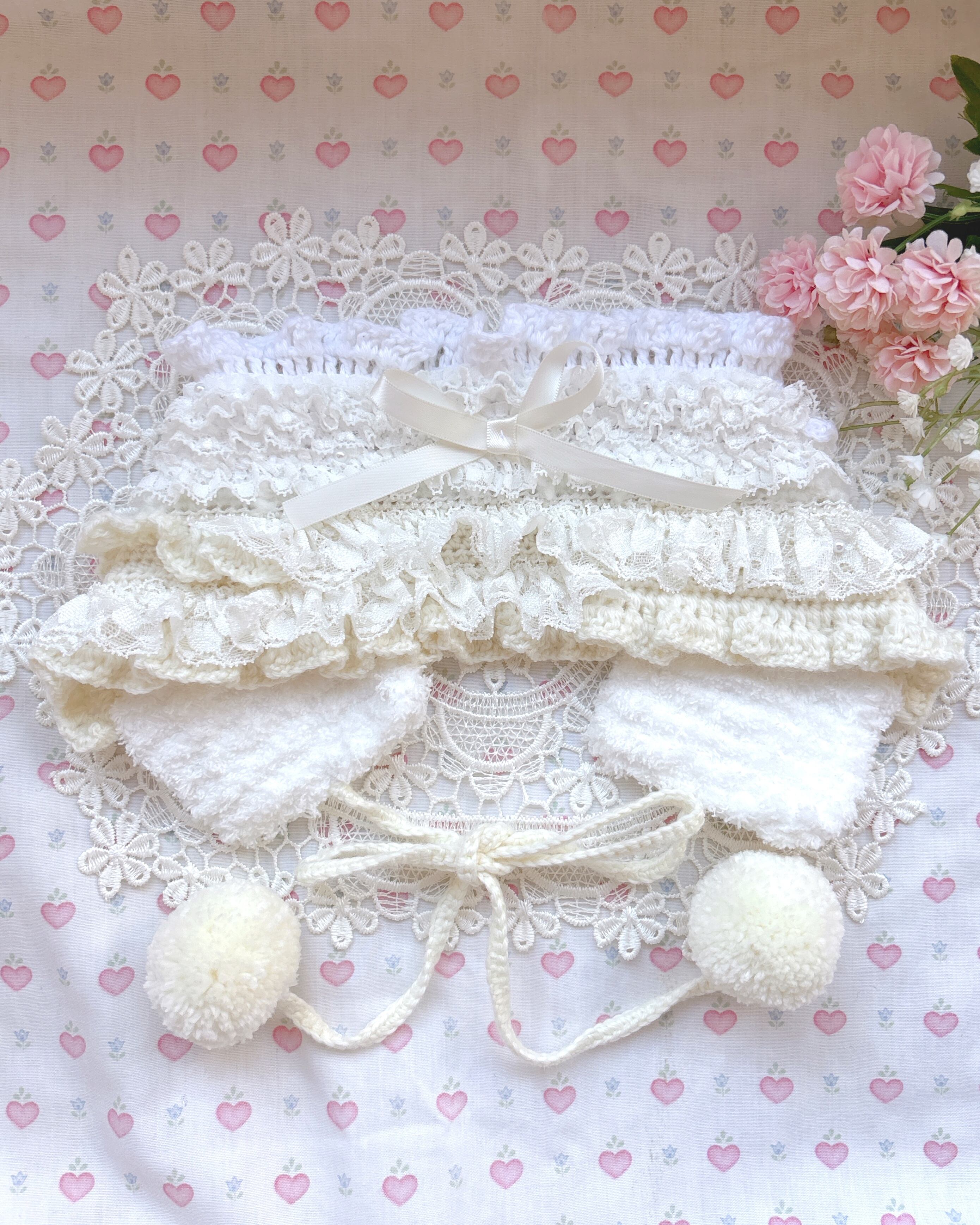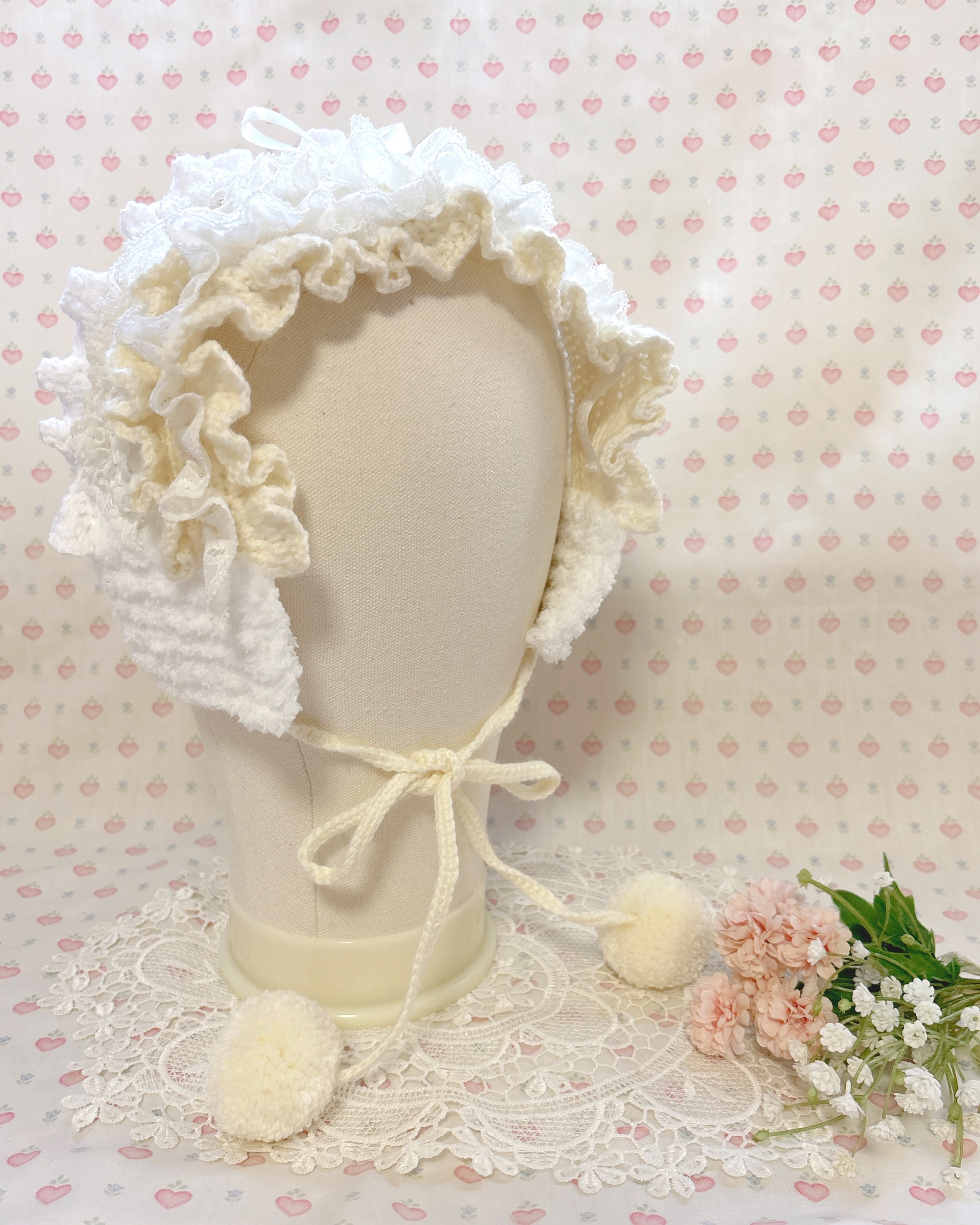 手編みでできたベッドドレスのような耳当てのようなアイテムです